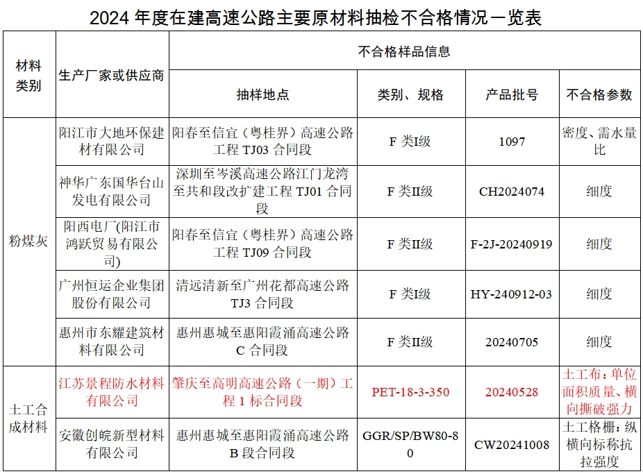 通告显示,抽检的主要原材料产品中,不合格材料主要集中在土工合成材料和粉煤灰两类,不合格参数主要为土工布的单位面积质量、横向撕破强力,土工格栅的纵横向标称抗拉强度,以及粉煤灰的密度、需水量比和细度等。