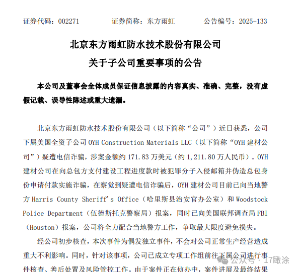 12月23日晚间,东方雨虹(002271.SZ)发布公告披露,公司下属美国全资子公司OYH建材公司疑遭电信诈骗,涉案金额约171.83万美元,折合人民币约1211.8万元。作为国内防水行业龙头企业,东方雨虹正加速推进国际化布局,此次突发风险事件,为其海外业务运营敲响了风险防控的警钟。